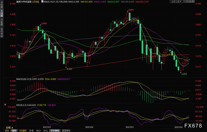 10年期国债的收益率周二上涨1.7个基点,报3.432%,为连续三个交易日上涨。通常与利率预期同步的美国两年期国债收益率上升2.7个基点至4.037%。