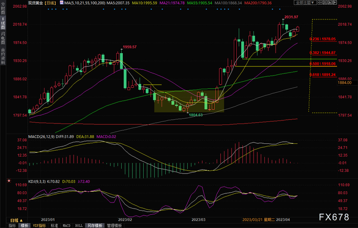 整体来看,威廉姆斯对进一步加息的呼吁、欧洲央行和英国央行可能进一步加息的预期暂时被市场忽略,市场更关注到美联储其他官员有关将很快结束加息、对加息保持谨慎的表态,美元指数走弱,给金价提供支撑,而市场预计美国通胀增速进一步放缓,可能会提升美联储年内降息预期,或将给金价提供进一步上涨动能。技术面来看,金价的回调受到10日均线支撑,目前回到所有均线上方,短线有望再度上探上周高点2031.97附近阻力。
