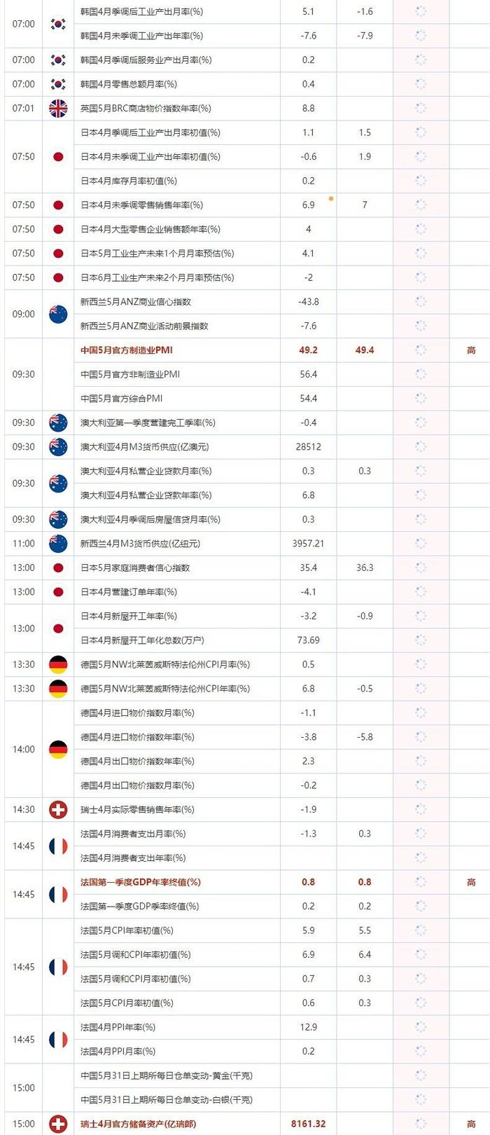 09:30 中国5月官方制造业PMI , 前值 49.2 , 预期值 49.4 , 公布值:待发布