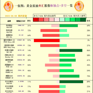 一张图:2023/06/08黄金原油外汇股指"枢纽点+多空占比"一览