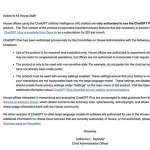 另外,这份备忘录也明确框定了国会职员们使用最新技术的范围。首先,职员们只能以“研究或评估”的理由来使用ChatGPT Plus,探索这项新技术如何对国会的日常运营起到作用,但目前并不允许职员们将其加入日常的工作流。同时,职员们不允许向AI复制并提交未曾在社会公开的敏感信息。
