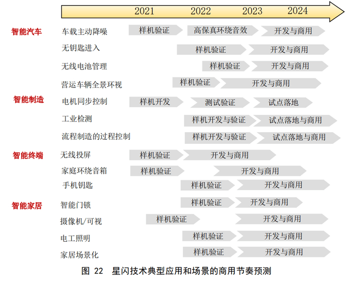 星闪产业化白皮书指出,根据标准、商用芯片和模组的进展,星闪联盟四个产业推广组预测星闪典型应用场景的商用节奏,大规模的商业落地有望于2023-2024年实现。
