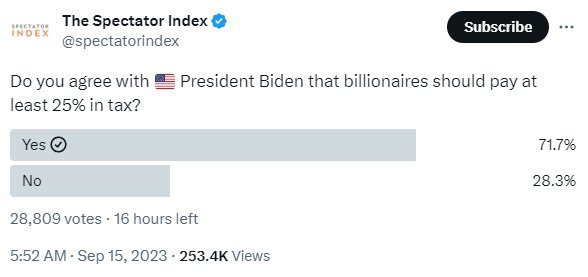 拜登发布消息不久后,The Spectator Index在推特发起投票活动,主题为“您是否同意拜登总统关于亿万富翁应至少缴纳25%税款的观点”,参与人数高达28809人,投下支持的比率达到71.7%,反对的有28.3%。