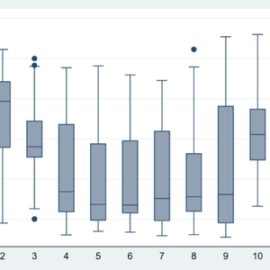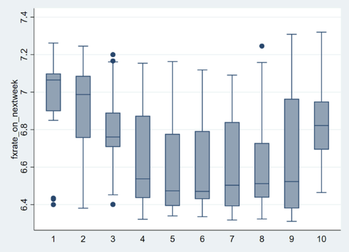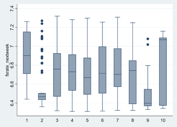 因此,为了更进一步直观地观察掉期点基差指标与汇率的相关性,本文使用2020年以来的大样本,按掉期点基差区间的十分位做样本分箱并分别绘制各个样本点后一周汇率的箱线图,其中第1组表示基差最小的组,以此类推。