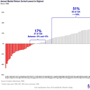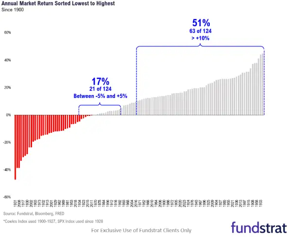 他介绍了自1900年以来股票年回报率的历史分布:股市在51%的时间里涨幅都在10%或以上。今年也正朝着这个方向发展,标准普尔500指数上涨了17%。