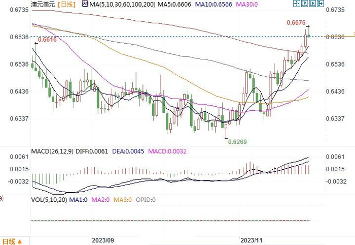 周二(11月28日),澳元兑美元继续冲高,盘中曾短暂触及近四个月最高的0.6665美元,当日收盘在0.6648。自几周前美国通胀数据疲软引发明年降息的预期以来,澳元呈现一路上涨趋势。因为本月稍早澳洲央行将利率上调至4.35%的12年高位后,市场仍预期该央行可能再次加息。利率期货暗示,澳洲央行在12月5日的下一次政策会议上加息的风险很小,但在2024年上半年加息的可能性为65%。澳洲央行总裁布洛克(Michele Bullock)周二也重申,澳洲的货币政策具有限制性,并在抑制需求方面发挥了作用,尽管服务业通胀比期望中的更为顽强。言中之意,表达出澳洲央行对于维持当前的高利率水平认为是必要且合适的。澳联储在货币政策上的鹰派态度,成为支撑澳元继续造好的主要影响因素之一。周三澳洲将公布消费价格指数(CPI),需加以密切留意。若数据显示澳洲通胀率仍处在高位,那么对于澳联储有望进一步加息的预期就会增强,而澳元或也会由此继续获得上行的动力。相反,若数据显示通胀水平出现明显下落,则澳元/美元会面临获利回吐的调整压力。