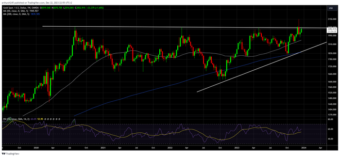 在黄金周线图观察到经典的上升三角形模式,该指标在技术分析中通常与看涨的市场情绪相关。