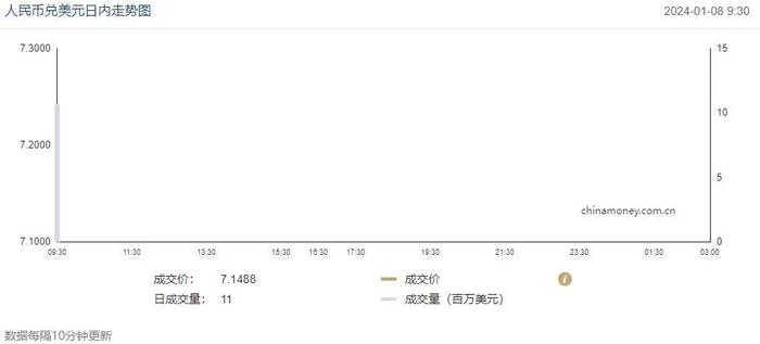 今日(1月8日),人民币兑美元中间价报7.1006,较前升值23个基点。在岸人民币兑美元即期汇率开盘价报7.1500,其后人民币呈震荡走势。离岸人民币兑美元开盘价报7.1607。