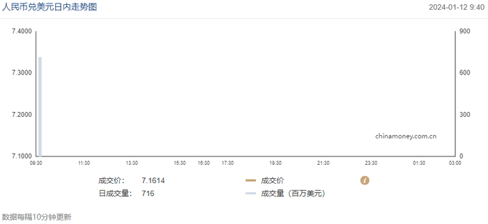 今日(1月12日),人民币兑美元中间价报7.1050,较前升值37个基点。在岸市场人民币兑美元即期汇率开盘价报7.1700,其后人民币呈震荡走势。离岸市场人民币兑美元开盘价报7.1749。
