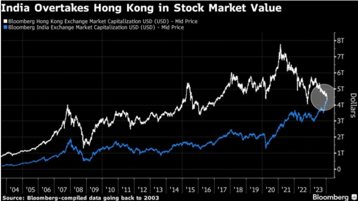 数据显示,截至周一收盘,印度交易所上市股票的总价值达到4.33万亿美元,而香港交易所上市股票的市值为4.29万亿美元。这意味着印度股市超越香港,成为全球第四大股票市场。