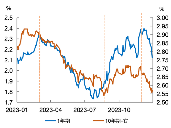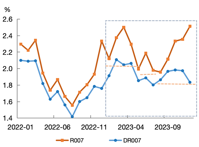 2023年,银行间市场7天质押式回购利率(R007)和存款类机构7天质押式回购利率(DR007)的均值分别较2022年上行26BPs、18BPs至2.21%、1.94%。全年R007整体呈现W型走势:一季度,R007月度中枢大幅上行,3月创年内新高达到2.50%;二、三季度震荡下行,8月回落至年内低点1.96%;四季度回升至2.30%~2.40%。