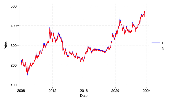 本文选取2008年1月9日至2023年9月28日,也即自我国正式推出黄金期货合约15年以来的日度数据进行研究。关于黄金期货价格数据,本文选用每个交易日当天最活跃的合约的日收盘价作为代表,来形成一个连续的期货合约,数据来源于上海期货交易所。关于黄金现货价格数据,本文选用在黄金现货市场上交易量最大的AU(T+D)的每日收盘价来作为现货价格的代表,数据来源于上海黄金交易所。