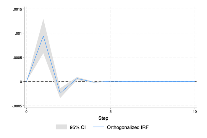 图4展示了DS对DF的脉冲响应,当黄金现货市场受到冲击后,黄金期货市场在第二期达到峰值0.0009,随后快速下降,在前四期表现为震荡状态,至第五期趋近于零。这说明黄金期货市场对于现货市场冲击的反应存在一定的滞后性,同时虽然冲击传递到了期货市场,但该冲击的效应较为微弱。该研究结果和前文Grange因果关系检验所得出的结论相符,研究结果表明在黄金市场中期货价格的影响更为显著,其对现货价格具有引导作用。