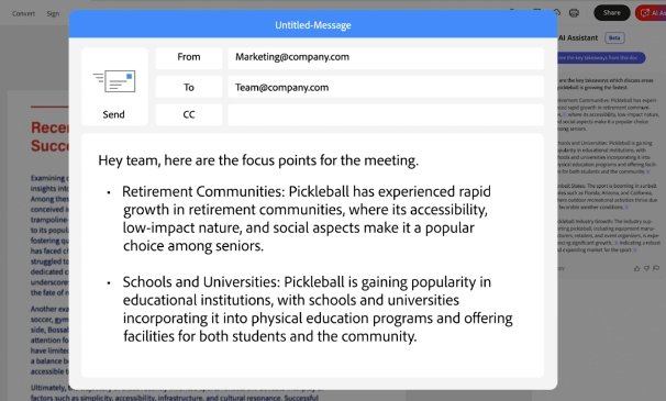 作为PDF的原生阅读器,Adobe给AI总结的内容提供了一个复制按钮。使用者可以将AI内容以邮件、PPT等多种形式来分享。