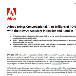 美股上市公司周二宣布,在旗下付费PDF阅读软件Acrobat中推出测试版的AI助手服务。等到测试结束后,会专门为这项AI服务推出一个收费档位。