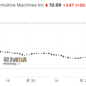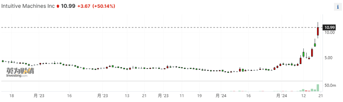 周二(2月20日),美国直觉机器公司(Intuitive Machines Inc)股价收升超50%报每股10.99美元,在连续三日暴涨后超过了其上市时10.03美元的价格,盘中最高一度达到每股12.05美元。