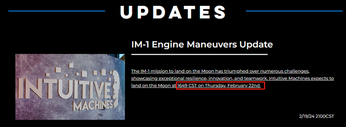 直觉机器预计,奥德修斯将于美国中部时间周四2月22日16:49登陆月球。如果这些步骤都顺利完成,这将成为自1972年阿波罗17号登月以来第一个在月球表面软着陆的美国航天器,也是首个实现此壮举的私营着陆器。