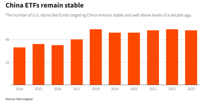 根据晨星的数据,去年共有4只在美发行的中国主题ETF推出,2022年则有2只,2021年有8只。