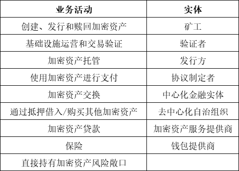 加密资产相关金融生态系统主要涉及三部分:加密资产市场、传统金融市场以及非金融用户(见图1)。加密资产市场涉及多项业务活动及实体(见表1),分为三个层次。第一层次为分布式账本技术(DLT)环境,是加密资产市场的核心层,主要有协议(protocol)制定者、矿工、验证者等创建加密资产及提供技术服务的实体。第二层次为金融环境,主要包括中心化金融(CeFi)实体和去中心化自治组织(DAOs),前者是向用户提供各种加密资产访问权限及法币存取款服务的大型中心化加密交易所,后者则是基于去中心化区块链网络并由智能合约管理的组织。第三层次为点对点(peer-to-peer)环境,钱包可以在不依赖第三方的情况下自行保管加密资产。最后,加密资产服务提供商为各层次涉及的业务活动如交换、交易、质押、支付和托管等提供支持。
