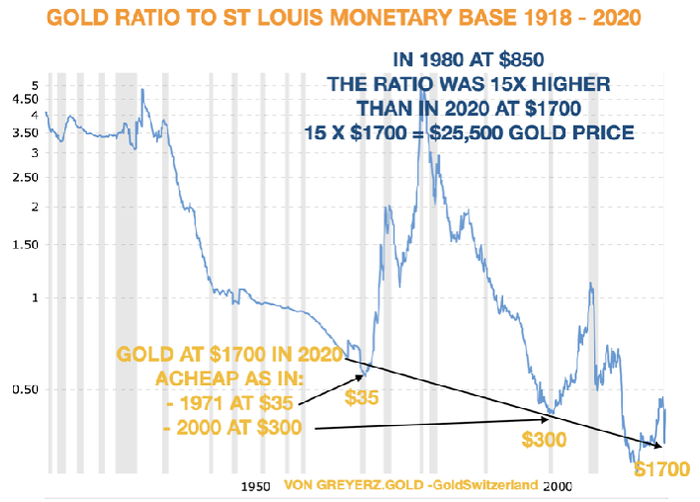 下图显示,相对于货币供应量,2020年初的黄金价格为1700美元,与1971年的35美元和2000年的300美元一样便宜。