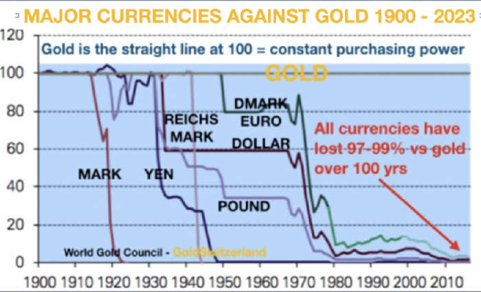 “仅自1971年以来,所有主要货币都损失了以黄金计算的97-99%购买力。在接下来的5-10年里,他们将失去剩下的1-3%,当然从这里开始是100%。”