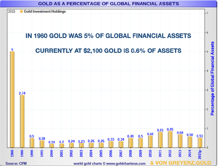 尽管黄金在本世纪的表现优于大多数资产类别,但其占全球金融资产(GFA)的比例仍然不到1%。目前黄金价格为2100美元,占建筑面积的0.6%。