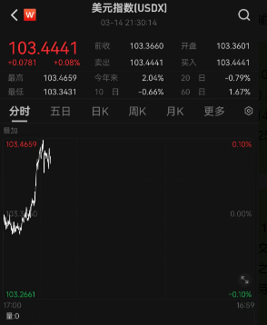 今日(3月15日),亚市早盘,截至北京时间9:30,美元指数报103.4441。