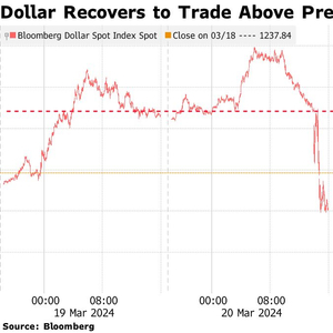 汇通财经APP讯——美元指数周四(3月21日)大涨0.58%,收复了周三的全部跌幅,收报104.02,为3月份最高收盘价,也录得一个多月来的最大涨幅,其中一个关键因素是瑞士央行意外降息,引发了交易员对其他央行宽松政策的猜测。彭博美元即期指数上涨0.5%,创下自2月13日以来的最大单日涨幅。周五(3月22日)亚市,美元指数窄幅震荡,目前交投于104.06附近。