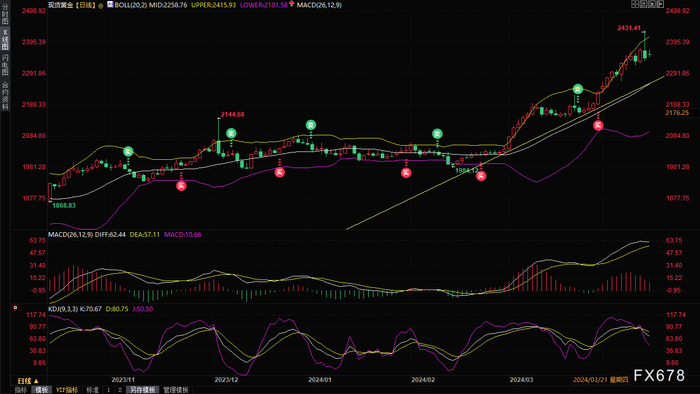 但由于大部分导弹和无人机都被拦截,也没有人员死亡的报道,此外,虽然以色列战时内阁决心回应袭击,但回应的时间与方式未定,虽然部分成员提议反击,但遭到防长等人的坚决反对;以色列告知美国,其不打算大幅升级冲突;拜登对以色列表示,不会参与对伊朗的进攻行动。避险情绪未能持续升温,目前金价回落至2354.19美元/盎司,如果中东局势未进一步恶化,则金价短线面临震荡筑顶的风险。