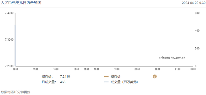 今日(4月22日),人民币兑美元中间价报7.1043,较前升值3个基点。在岸人民币兑美元即期汇率开盘价报7.2394,其后人民币呈震荡走势。离岸人民币兑美元开盘价报7.2508。
