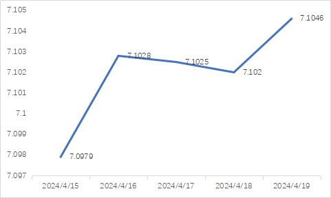 今日,人民币兑美元中间价报7.1043,较前升值3个基点。
