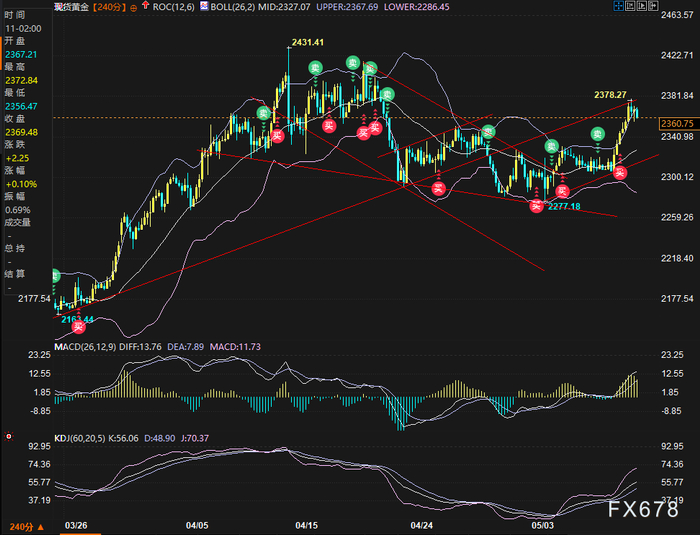 黄金上周的走势,走出了我们周一分析情形中的“最强情形”,在测试回踩2300附近支撑站稳之后,一路上扬突破2352阻力,其后涨幅扩展到2380-2400区域的下沿附近。金价在5月10日欧市盘中触及2378.27后回落,市场可能正在回踩2360-2353区域支撑,也可能扩展到测试2344,预计大概率能站稳支撑并进一步朝着2380-2400区域进发。