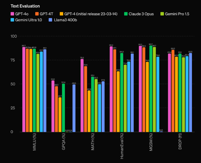 性能方面,根据传统基准测试,GPT-4o在文本、推理和编码等方面实现了与GPT-4 Turbo级别相当的性能,同时在多语言、音频和视觉功能方面的表现分数也创下了新高。