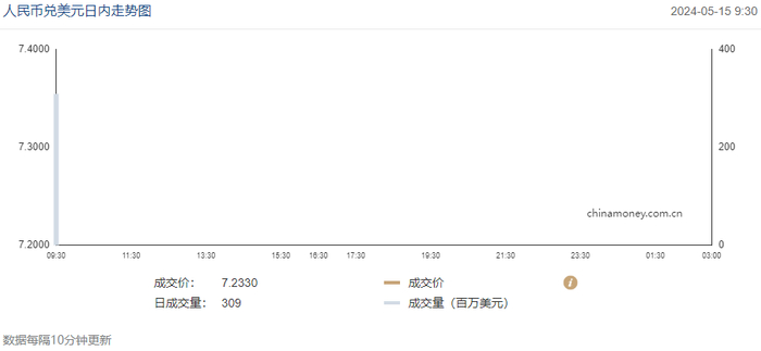 今日(5月15日),人民币兑美元中间价报7.1049,较前升值4个基点。在岸市场人民币兑美元即期汇率开盘价报7.2322,其后人民币呈震荡走势。离岸市场人民币兑美元开盘价报7.2400。
