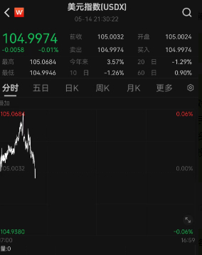 今日(5月15日),亚市早盘,截至北京时间9:30,美元指数报104.9974。