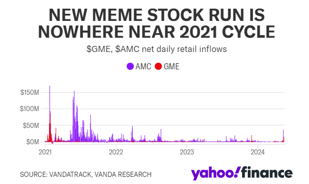 然而,至少在目前阶段,散户的市场行为与2021年的资金流入水平其实仍相去甚远。根据VandaTrack的数据,本周一游戏驿站净流入资金规模为1580万美元,而AMC则吸引了3750万美元,这两组数字其实仍远远不如2021年1月时——当时游戏驿站和AMC的单日资金流入峰值,曾分别高达8750万美元和1.7亿美元。