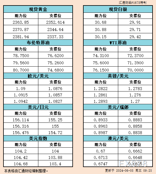 6月5日亚市支撑阻力:金银原油+美元指数等六大货币对