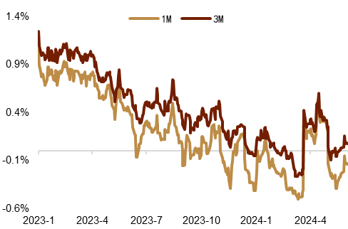 美国经济数据今年以来表现出超预期的韧性,我们认为年内降息仍是基准情形,随着货币市场的利率传导,美元短端利率有望走低,并带动中美利差的回落。具体看,近期美国4月经济数据表现出现下滑,通胀及就业数据均出现了进一步降温的迹象。近期2024年FOMC票委,亚特兰大联储主席博斯蒂克表示[10]美联储可能在第四季度降息。美联储褐皮书则表示[11]“由于不确定性增加和下行风险加大的报道,整体前景略显悲观”。我们认为美国经济或将在高利率环境下进一步承压,年内存在一定降息空间。随着美联储货币政策立场转变,我们认为降息交易将渐渐升温,并将带动短端美元利率的回落。我们发现中美短端利差的大部分波动由美元利率贡献(图表24),因此即使下半年国内降息预期进一步升温,我们认为年内中美短端利差的温和回落仍是较大概率事件。然而考虑到美国经济韧性依旧较强,我们认为年内市场的降息交易的绝对空间可能相对有限,中美利差倒挂程度可能维持在较深的水平,人民币汇率的波动可能尚不会明显抬升,套息交易亦可能继续对汇率产生一定压力。