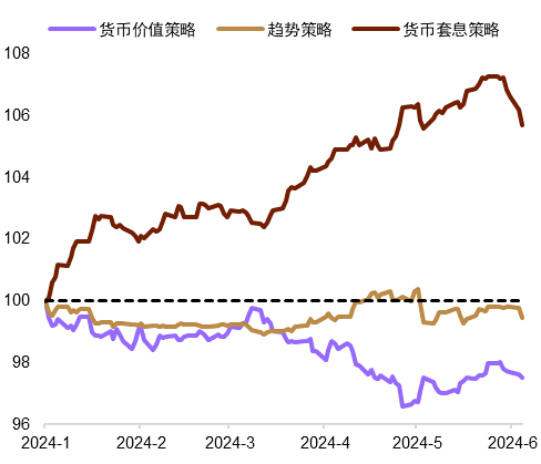 2024年前五个月,美元指数从2023年底的低点有所反弹,但总体幅度温和。具有韧性的美国就业和通胀等硬数据延后了市场对美联储年内降息启动时间点和总体幅度的预期。美联储保持利率“更高更久”的交易推升了美债收益率,在利差因素的影响下,美元对主要货币的汇率都有不同程度的走高。不过,美元指数的上升幅度非常温和,总体上没有脱离2023年以来大的横盘整理区间,这一方面是因为美国的经济数据目前只是延后了降息时间点,尚不足以支持美联储重启加息周期,另一方面则是今年英国和欧洲等地的经济有所恢复,美国以外国家的经济企稳和利率上行限制了美元的升幅。在高利差和偏低汇率波动的双重作用下,套息交易仍然是今年前五个月表现最好的外汇交易策略。日元、瑞士法郎等低息货币在套息交易中作为融资货币成为了被做空的对象,是今年前五个月表现相对偏弱的货币。