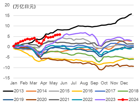 外国资金也没有出现外逃,反而是扩大了对日本投资。上述直接投资之外,日本股票方面,截至5月24日,外国投资者累计净买入约5.9万亿日元的日股(图表52),为2013年以来的同期最高水平(但我们需强调大部分外国投资者买入日股会做汇率对冲,因此对汇率影响有限)。