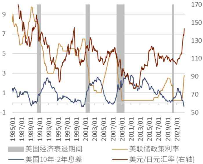 未来,世界主要经济体陷入衰退概率依然存在,同时伴随日本以外国家加息的深入,金融风险的概率有所增大。通过对以往经济衰退时期的日元走势研究发现,在大部分衰退时期,日元的避险属性都得到触发,实现了强于美元的升值(图表55)。此外,全球经济陷入衰退时,与欧美存在降息的余地所不同,日本的政策利率进一步下行的余地较小,此举又会加速日本与他国的货币政策收敛,有助于日元的升值。