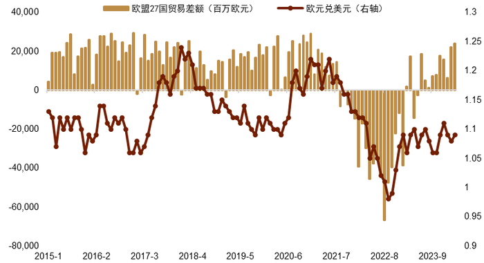 外部均衡对汇率的重要性 外部均衡指的是一个国家作为一个整体,其对外是累积净资产还是净负债。通常,经常账户长期逆差可能是一国经济结构失衡、汇率扭曲等因素的反应,随着该国对外债务逐步地累积,其金融脆弱性也会有所增加。外部失衡意味着一国需要持续通过对外融资来保持国际收支平衡。而随着外债的积累,海外投资者不愿更多为该国融资时,该国就容易发生国际收支危机,其货币也会走弱。作为国际货币的发行国,美国享受着铸币权的优势。这意味着美国欠下的对外债务主要是美元的形式,通常,以本币欠下对外主权债务并不容易出现违约的情况(因为可以通过增发货币还债)。因此,美国的外部失衡并不容易直接酿成国际收支危机。但从另一个维度看,作为国际货币的供给方,美国需要不断通过对外债务的累积来向外提供美元,以满足日益增长的全球贸易和投资需求。早在金本位时期,美国经济学家罗伯特·特里芬就指出[4]美国作为国际货币发行国会面临一对矛盾:日益增长的国际金融和贸易会要求美元在海外不断增加沉淀,这对美国国际收支来说就会意味着经常收支长期逆差;而美元作为国际货币核心的前提是必须保持美元币值稳定,这又要求美国是一个国际贸易收支长期顺差国。这似乎成为了一对无法解决的矛盾。作为长期经常收支逆差的美国,最终无法保证美元对黄金币值的稳定而选择与黄金脱钩。在布雷顿森林体系崩溃后,新的信用货币+浮动汇率的货币体系部分解决了美国的对外偿付问题,但仍然无法解决美国对外失衡的问题。因此,在美国的经常项目逆差连续扩大之时,美元汇率往往会出现一定程度的贬值,直到经常项目改善带动收支好转。从历史经验看,80年代和2000年初美元指数的周期性回落与美国对外账户的加剧失衡与再平衡存在一定关系(图表15)。2023年美国的经常账户赤字占GDP的比重约为3%,该水平相比2022年略有改善,但仍处于过去10年相对偏高的水平。这意味着,在未来的某个时间点,美国仍可能须通过美元的走软来重新平衡对外账户。