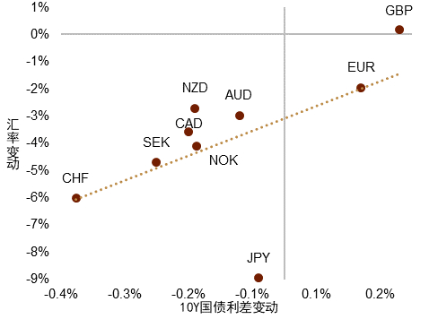 图表5:G10货币兑美元变动 vs. 10Y国债收益率差
