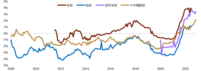 注:存款利差为一年期大额美元存款利率和四大行人民币定期存款利率之差,贷款利差为6-12个月美元贷款和人民币贷款利率之差,货币市场利差为SOFR和DR001利差,十年期国债利差为十年期美国国债与中国国债收益率之差
