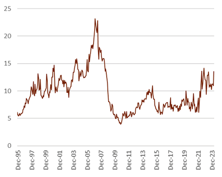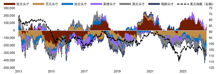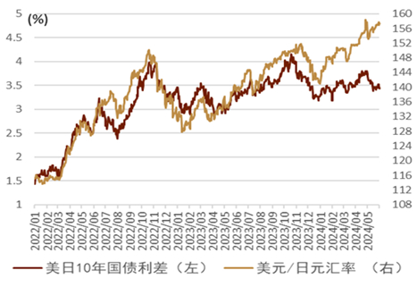 2024年下半年,我们认为“更高更久”的叙事会让套息交易仍是一定时间段内的交易主题。在这段时间内,美元指数仍然会受益于相对偏高的利率,而以日元为代表的低息货币则可能会受到套息做空头寸的压制,表现偏弱。不过,与此前不同的是,我们并不认为套息交易会给予美元很大的上行空间,因为美债利率缺乏持续上行的基础,且美元多头目前已经较为拥挤。