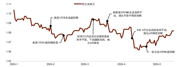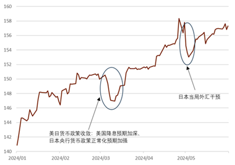 2024年前五个月,美元指数从2023年底的低点有所反弹,但总体幅度温和。具有韧性的美国就业和通胀等硬数据延后了市场对美联储年内降息启动时间点和总体幅度的预期。美联储保持利率“更高更久”的交易推升了美债收益率,在利差因素的影响下,美元对主要货币的汇率都有不同程度的走高。
