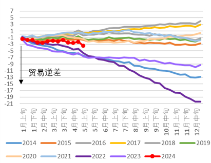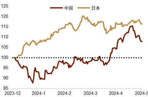 外部因素:偏强的美国经济推动了中美利差的走阔及市场主体对美元资产的偏好,今年优异的海外股市表现亦导致国内股市吸引资金的能力有所削弱。从债券角度看,由于美债利率的波动率明显大于中债,因而中美利差的走向往往由美国利率决定。今年以来美国经济及通胀数据均保持一定韧性,长短端美债收益率均有所走高。国内债券收益率则在货币政策宽松及资产荒等因素演绎下温和走低。二者合力导致中美国债等利差明显攀升。一方面,年初日本等亚洲主要国家的权益市场表现优异,国内股市则相对落后(图表17),资金一度出现“跷跷板”现象,增持国内权益资产的意愿偏低。不过这样的趋势在4月下旬以来有所反转,国内股市表现较好,跨境资金亦有明显修复。另一方面,中美利差或导致企业等市场主体结汇意愿偏低,外汇市场供求出现失衡。综上,中美利差较大,市场预期偏弱的背景下,市场增持人民币资产的意愿偏低,人民币供需失衡压力即体现为汇率的贬值。