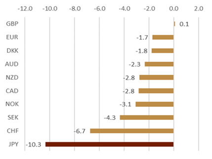 图表7:美元对其他G10货币的1M掉期隐含利差