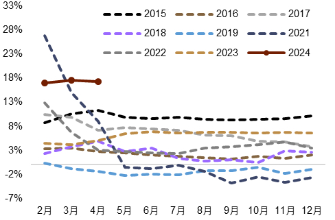 ► 投资领域,5月以来,新增专项债及超长期特别国债等政府债券发行节奏加快,后续或有望支持基建投资增速,“大规模设备更新”亦有助于提振制造业投资。发改委在4月下旬表示[13]完成2024年地方政府专项债券项目的筛选工作,并强调“推动尽快形成实物工作量,积极扩大有效益的投资”。5月新增专项债约3,784亿元,为年内单月发行规模新高(图表27)。一万亿元超长期特别国债亦在5月至11月期间逐步发行,发改委表示[14]后续将“督促指导各地方加大前期工作力度,分级分类做好用地、环评等要素保障,推动项目尽快开工建设”。大规模设备更新方面,国家统计局称[15]设备工器具购置投资1-4月份同比增长17.2%(图表28),拉动全部投资增长2.2个百分点。发改委则表示[16]“中央投资加大对设备更新和循环利用项目的支持力度,设立5,000亿元科技创新和技术改造再贷款”,我们认为设备更新投资在下半年有望在政策支持下继续支持投资增长。
