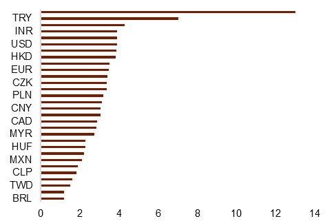 在美元利率总体上行的大环境下,主要货币对美元大都走弱,但幅度不一(图表2)。由于利差的拉宽和外汇市场总体的低波动性,套息仍然是今年上半年比较流行的交易策略。高息的英镑、印度卢比和俄罗斯卢布等货币表现更好,而低息的日元、泰铢、韩元和G7央行中首个降息的瑞士法郎则表现偏弱。当然,有些货币因为自身的原因成为了例外,作为高息货币的巴西雷亚尔在前5个月的跌幅超过了7%,巴西央行的降息预期以及外界对巴西财政健康的担忧让巴西雷亚尔相关的套息交易相较其他高息货币更早逆转。而人民币作为低息货币却跑赢了一篮子非美货币,我们认为稳汇率政策的实施压制了人民币的波动性是其表现相对偏强的重要原因。